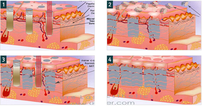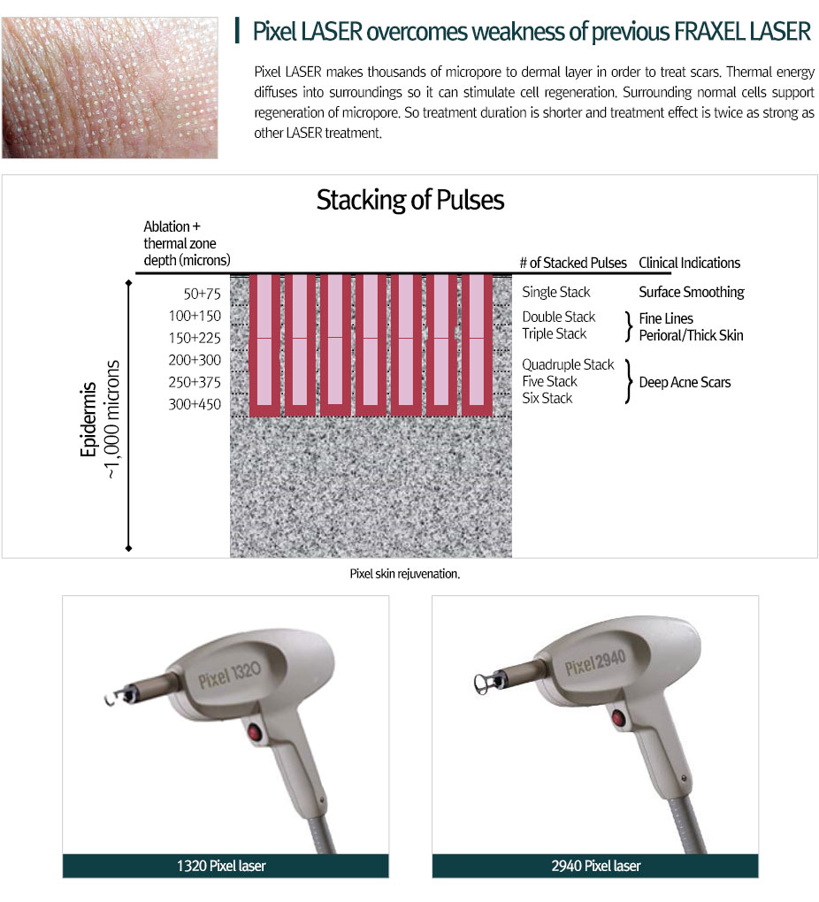 The wavelength of 1320 Pixel LASER is not enough to abrade skin surface. So it can make 2.5mm depth micro thermal zone without damaging the skin surface. The wave length of the light stimulates collagen contraction and produces collagen and elastin in the inner skin layer to increase elasticity, tighten pores and help refine wrinkles. It has short recovery time because it does not abrade skin surface. Combination therapy with Tenor, Photo RF, and V-star LASER can increase the effect.