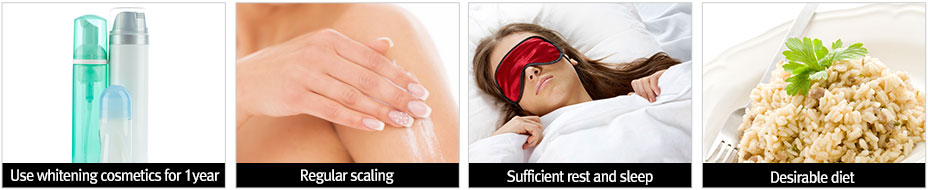 Generally, aging process begins from 25 years old. Before 20s, skin color returns rapidly after the summer suntan. But those over 25 need more recovery time and melasma and freckle appears. Therefore whitening treatment is recommended for those who are around 25 years old. Conventional method of whitening was decreasing activity of melanocyte by blocking sun or making pigment dimmed. Recently, new method has been introduced that removes pigment producing cell.