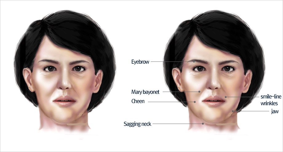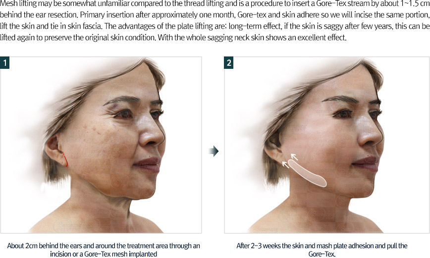 Mesh lifting may be somewhat unfamiliar compared to the thread lifting and is a procedure to insert a Gore-Tex stream by about 1~1.5 cm behind the ear resection. Primary insertion after approximately one month, Gore-tex and skin adhere so we will incise the same portion, lift the skin and tie in skin fascia. The advantages of the plate lifting are; long-term effect, if the skin is saggy after few years, this can be lifted again to preserve the original skin condition. With the whole sagging neck skin shows an excellent effect.