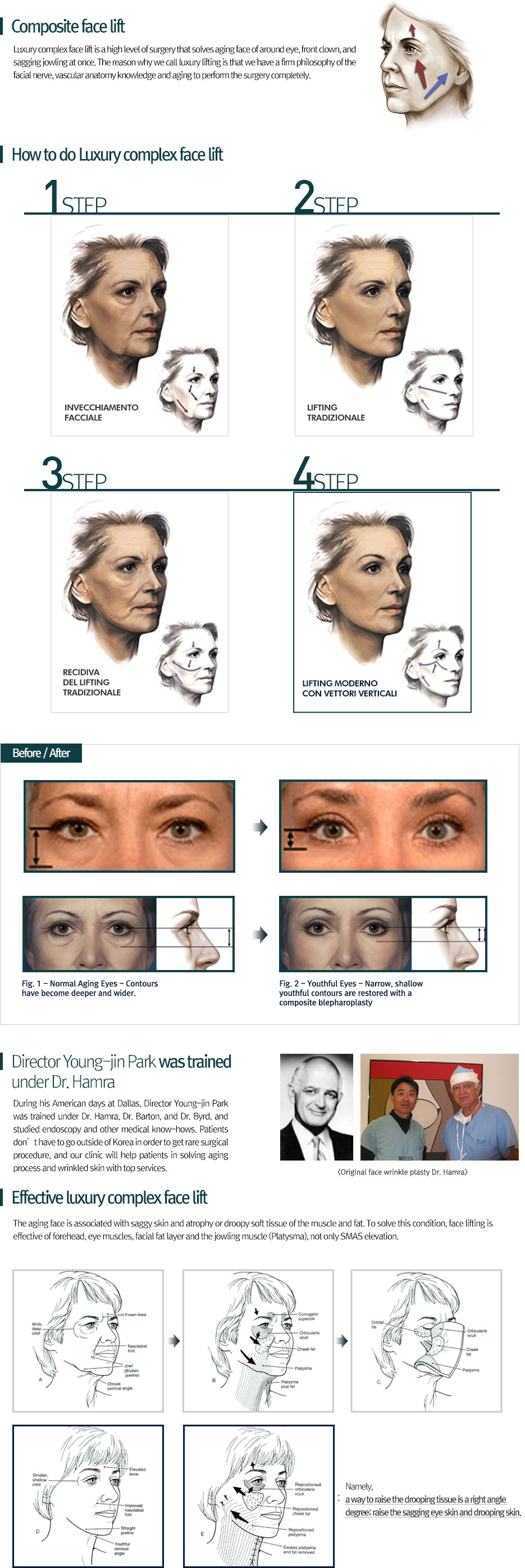 During his American days at Dallas, Director Young-jin Park was trained under Dr. Hamra, Dr. Barton, and Dr. Byrd, and studied endoscopy and other medical know-hows. Patients don’t have to go outside of Korea in order to get rare surgical procedure, and our clinic will help patients in solving aging process and wrinkled skin with top services.