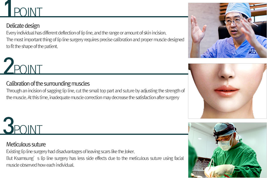This surgery through an incision in the mouth corner mouth corner rounded down muscle strength, muscle power conditions. This procedure is part of the skin and cut the fine stitching, and make this procedure attractive lip line. This procedure will minimize postoperative scars that you will notice none at all. The operation proceeds to the small anesthetic, and the operation takes about 30 minutes to 40 minutes. The micro-surgical repair of the resected area is sutured. Seams and remove as much as possible so as not to leave a scar, depending on the individual stitches can be removed. This surgery does not have big swelling and bruising, but we recommend you to take 2-3 months off after surgery to avoid excessive movement of the lips for fast recovery