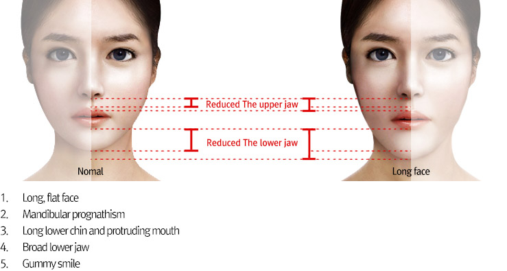 Patients with relatively long face may often have mouth protrusion and mandibular prognathism. Because the face is asymmetrical, the entire face look like it is out of balance.