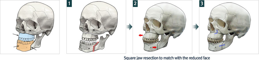 Two-Jaw surgery is suitable for patients with manibluar prognathism, facial asymmetry, and mouth protrusion. The upper jaw is partially cut and shifted upward to correct the long philtrum. After a consultation with the orthodontist, the patient may decide to reposition the upper jawbone. In case of severe facial asymmetry, the bone may be shifted to either side. Once the upper jawbone is tightly fixed, the lower jawbone may be repositioned. If the two-jaw surgery is insufficient, additional facial contouring procedures may be carried out to correct the mandibular bone, chin, and cheekbone.