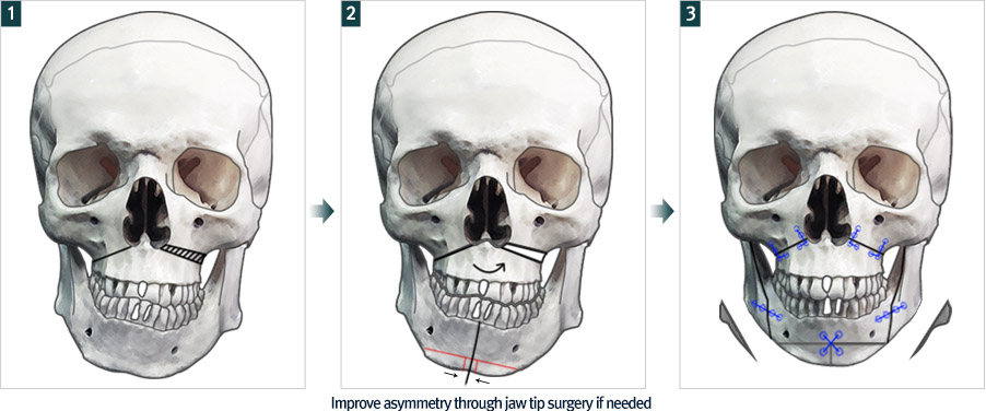 When the patient has facial asymmetry, mandible reduction surgery is performed along with two-jaw surgery. During the procedure of two-jaw surgery, the lower mandible is easily exposed, thus removing the angles of the mandible can be done easily. Bringing the balance to the mandibles can enhance facial asymmetry.