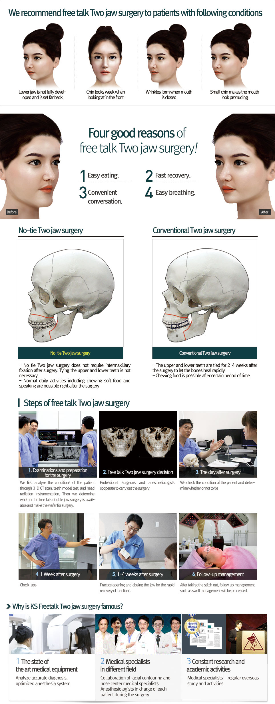 Whereas the conventional two-jaw surgery tied the upper and lower teeth, making it difficult to breath, speak, or chew food, free-talk two-jaw surgery does not tie the teeth and enables these activities