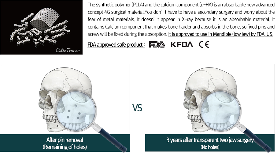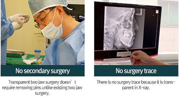 Two jaw surgery is the corrective jaw surgery that fracture of the upper and lower jaw bone when the jaw position or function is not normal. The operation will improve not only masticatory fuction, but also better appearance. Clear two-jaw surgery is an operation which uses synthetic polymer fixation screw. The operation will improve not only masticatory fuction, but also apprearence. Clear two-jaw surgery is the operation which uses synthetic polymer fixation screw.