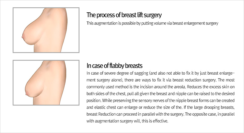 In case where small degree of sagging is not severe, the breast lift is possible through enlargement surgery. In the case of having worst drooping on the breasts, however, the procedure will apply incision around the edge that will eventually fix the overall shape of the breasts. This procedure does not simply remove the tissue but it is lifting breast to its firmness, which is the whole purpose of it.