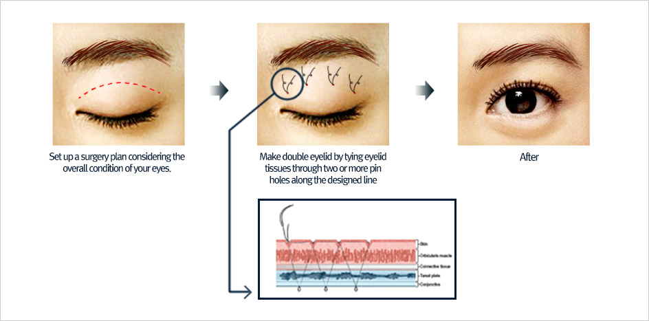 Non-Incisional Method sutures an eyelid with only a few number of holes without incision. Quick recovery is expected and the suture is expected to stay intact due to our Double Tying Consecutive Non-Incisional Method which strengthens the stitch by adding the connection of the skin and muscle.