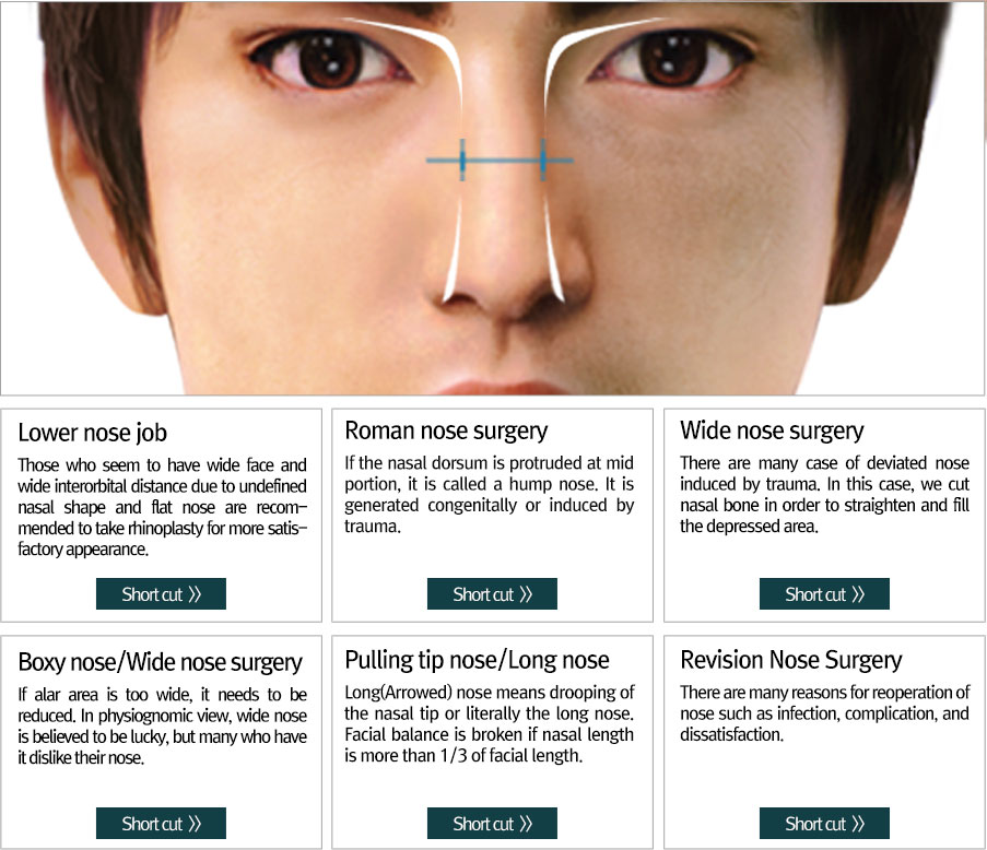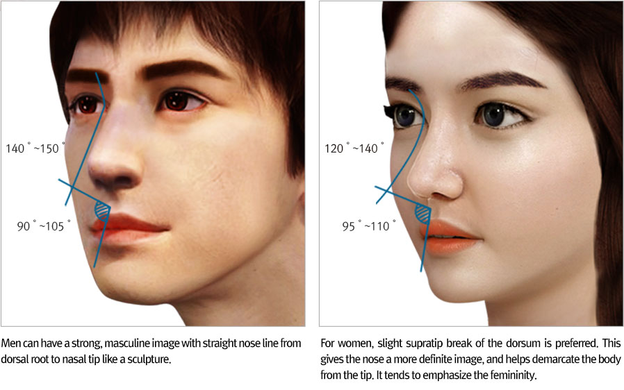 Nose occupies the largest proportion of men plastic surgery and the nose is the most important part of the surgery, depending on how the image is changed. The ideal shape of man’s nose is higher and longer than woman’s and from forehead to nasal tip’s degree is 140~150. Shape is often preferred outstretched straight or smooth curved. We consider improving aesthetic parts and the functional portions and recommend to those who have weakened or not sharp impression