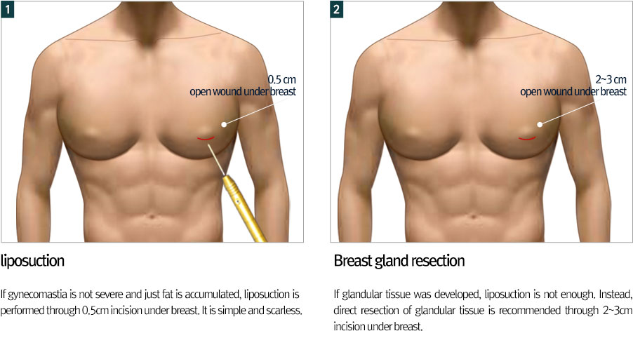 Gynecomastia consists of mammary gland and fat tissue. Liposuction fat tissues are typical of a certain extent can be removed. However, the hard wired distribution around the nipple tissue removed by liposuction is not common, and can be cut out surgically, but the scars remain on the outside. Gynecomastia therapeutic approach to high-frequency regions through a thin needle to dissolve the organization, and then to remove large amounts of fat, where the result is stunning. Such treatment is possible where less damage to the surrounding tissue is possible, recovery is faster, and can dissolve mammary gland, yet only leave little scars.