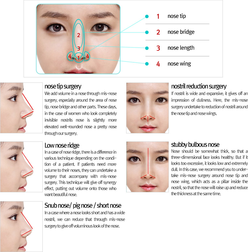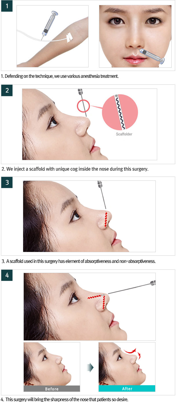 This surgery uses latest surgical technique that is differentiated from other techniques, and it uses insertion inside the scaffold of a nose. By inserting scaffold inside the nose, the surgery will adjust the nose’s angel, bridge, tip, and wing, and it also prolongs the length of the nose for a very long time.