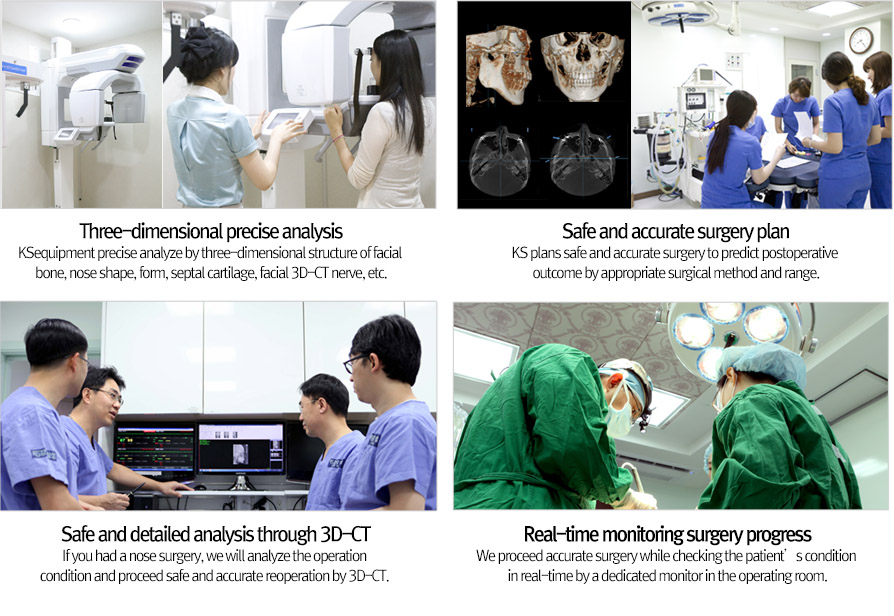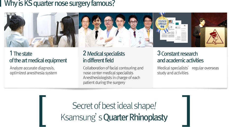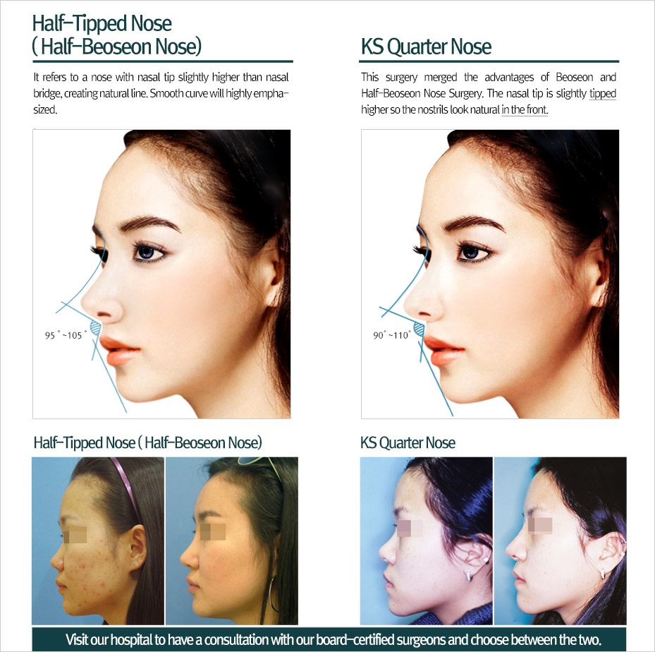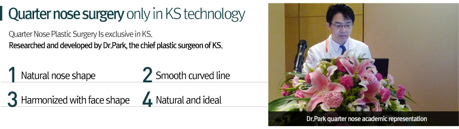 Quarter Nose Plastic Surgery, which combined the benefits of previous Tipping(Beoseon버선) and Half-Tipping Nose Surgery, slightly augments the nasal tip and thus the nostrils look natural in the front. Quarter Nose Surgery is only available in KS as this method was developed and researched by Dr. Park, the chief plastic surgeon of KS.